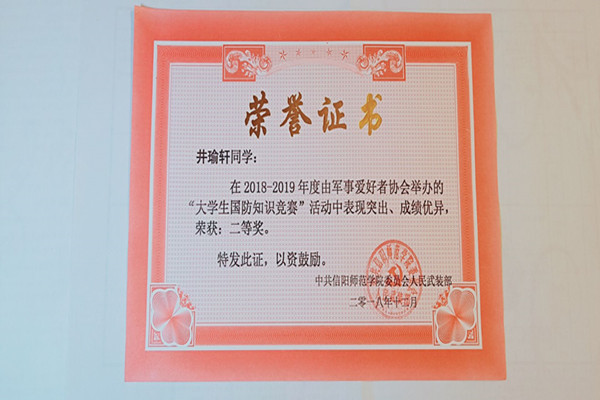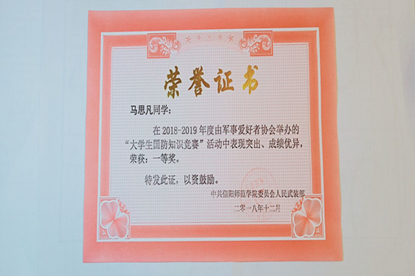 金年会金字招牌诚信至上2018级员工积极参加2018–2019年度由军事爱好者协会举办的“老员工国防知识竞赛”活动。部分同学在此活动中表现突出、成绩优异。中共信阳师范学院委员会人民武装部为其颁发证书,以资鼓励。
