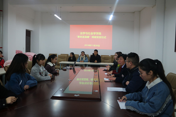 活动首先由樊书记致辞。她带领全体与会人员重温了习近平总书记在中共十九大报告中“不忘初心,牢记使命,高举中国特色社会主义伟大旗帜,决胜全面建成小康社会,夺取新时代中国特色社会主义伟大胜利,为实现中华民族伟大复兴的中国梦不懈奋斗”的讲话,并着重强调了“坚决打赢脱贫攻坚战”和“优先发展教育事业”两个奋斗目标,她提出,此次活动以“扶贫”为契机,进一步落实“扶志”、“扶智”,作为新时代青年应当树立远大理想,尊敬师长,努力学习,砥砺前行,不懈奋斗,为实现中华民族伟大复兴梦贡献力量。接着由团委书记杨胜利宣读受助员工名单,樊书记亲自为同学们发放棉被。活动最后,与会老师与同学们集体合影留念。
